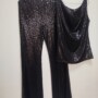 Le tissu noir brillant reflète la lumière avec subtilité, apportant une touche glamour sans effort. Sa coupe moderne et ajustée met en valeur vos formes tout en offrant une liberté de mouvement agréable. Les détails soignés, comme les finitions impeccables et les accents minimalistes, font de cet ensemble une pièce incontournable de votre garde-robe.