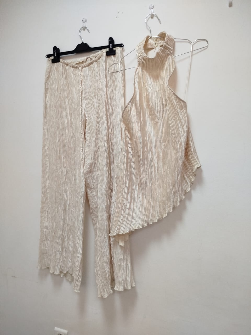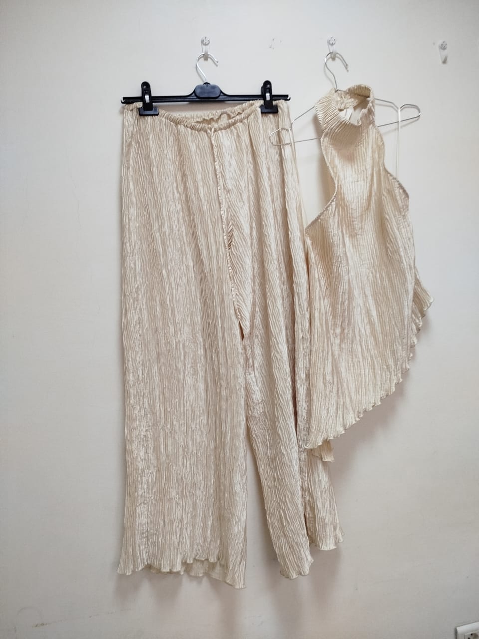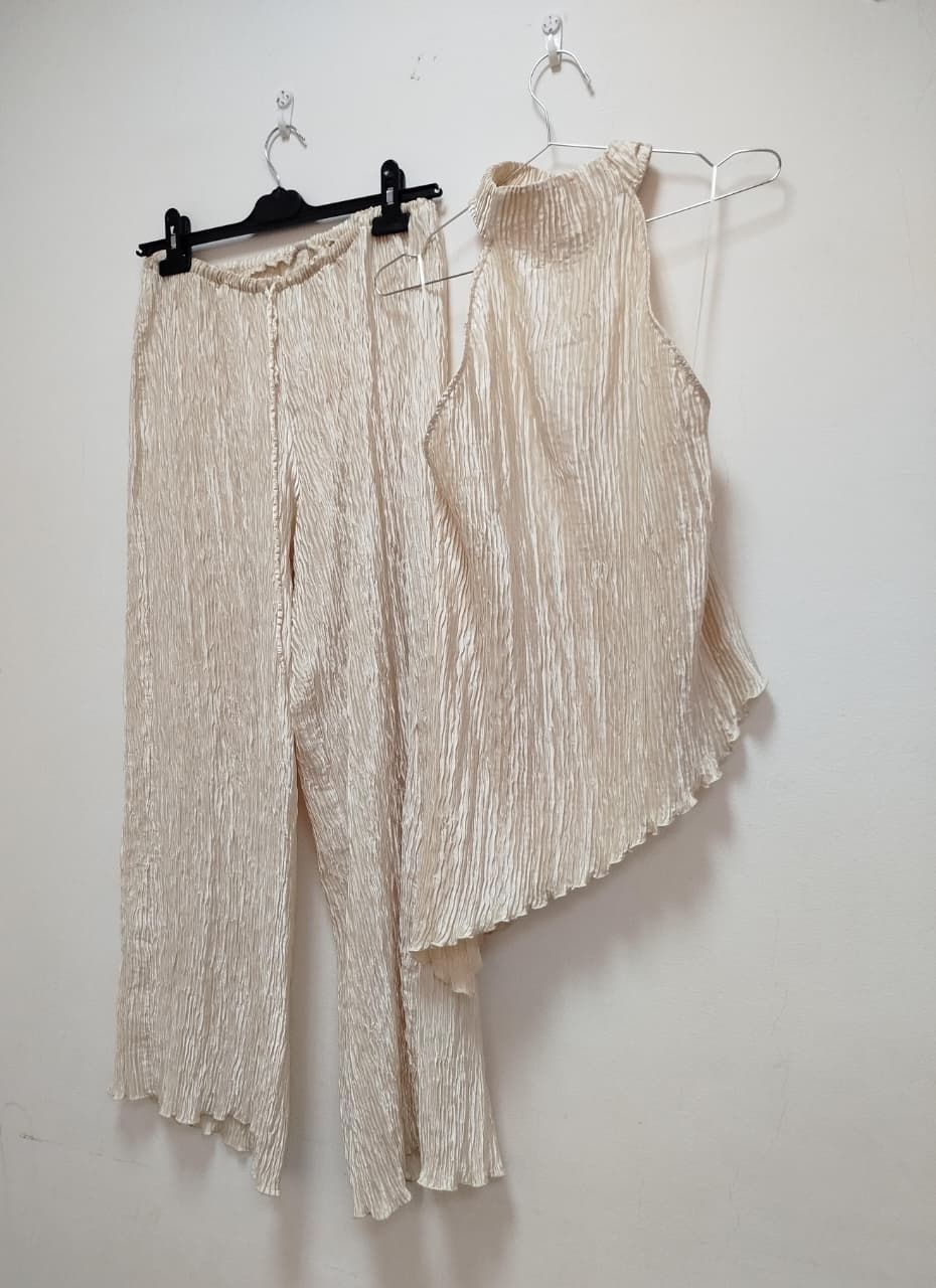 Raffiné et intemporel, cet ensemble se compose d’un pantalon fluide et d’un haut plissé en ivoire lumineux.