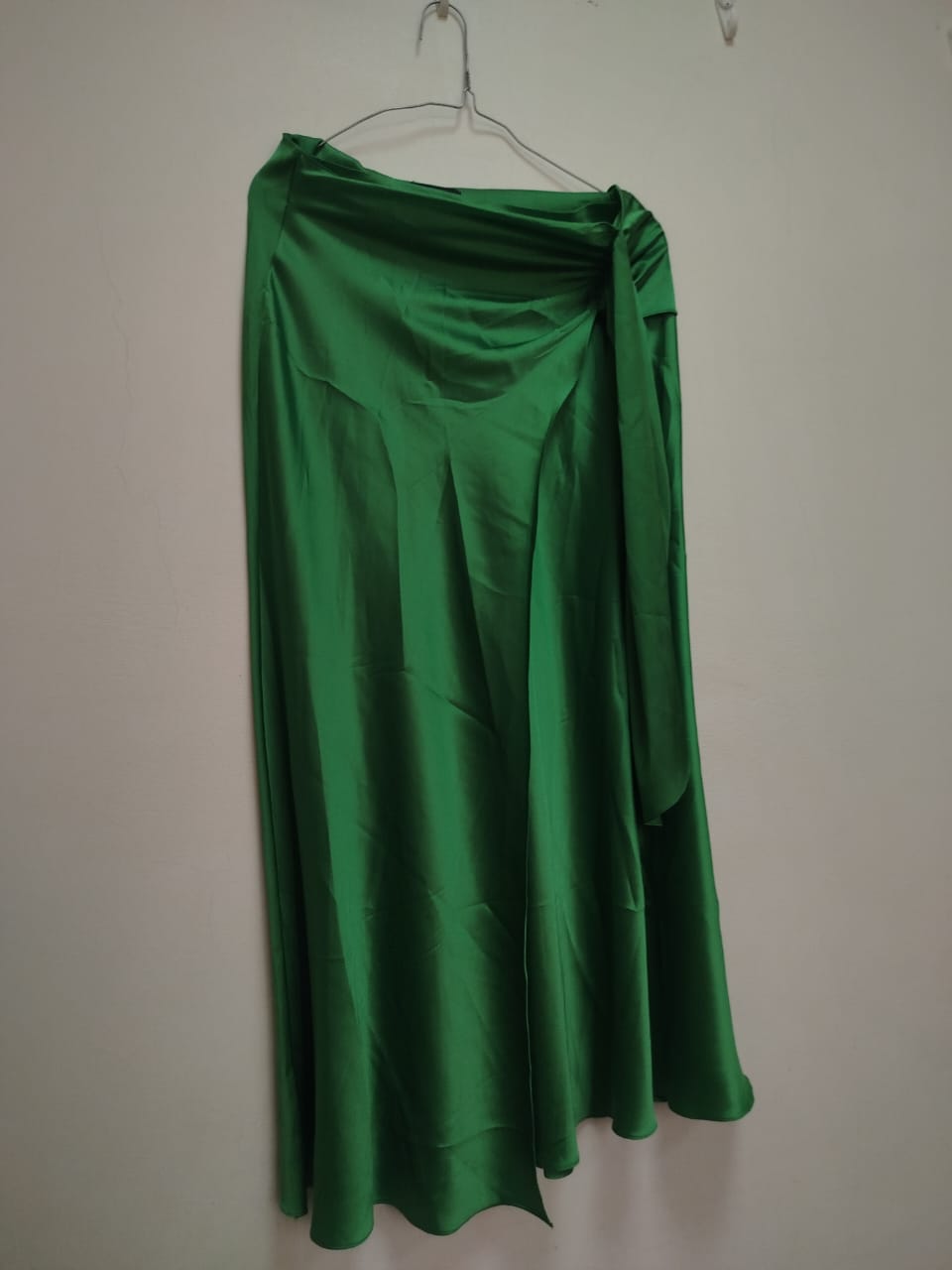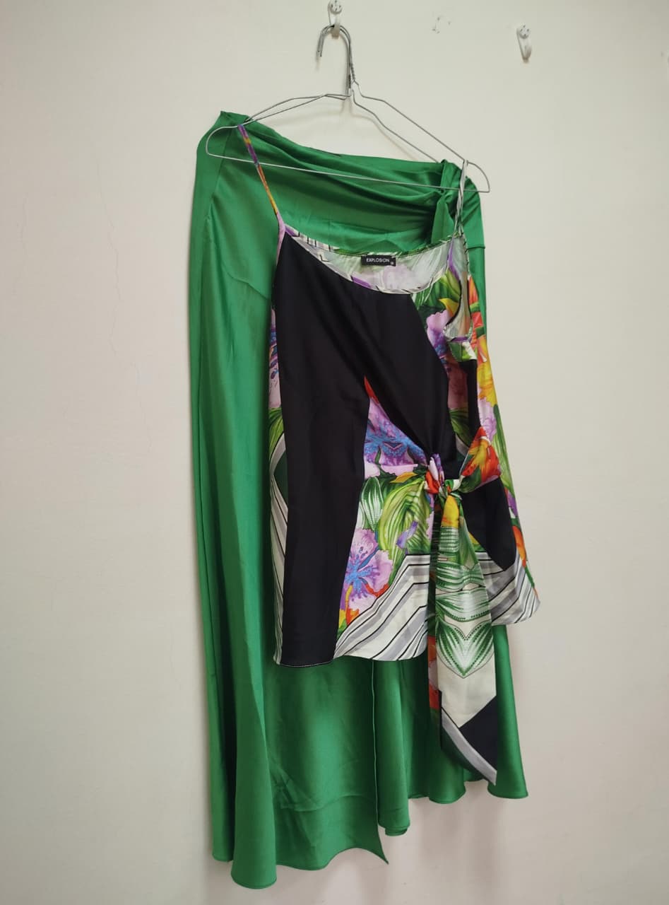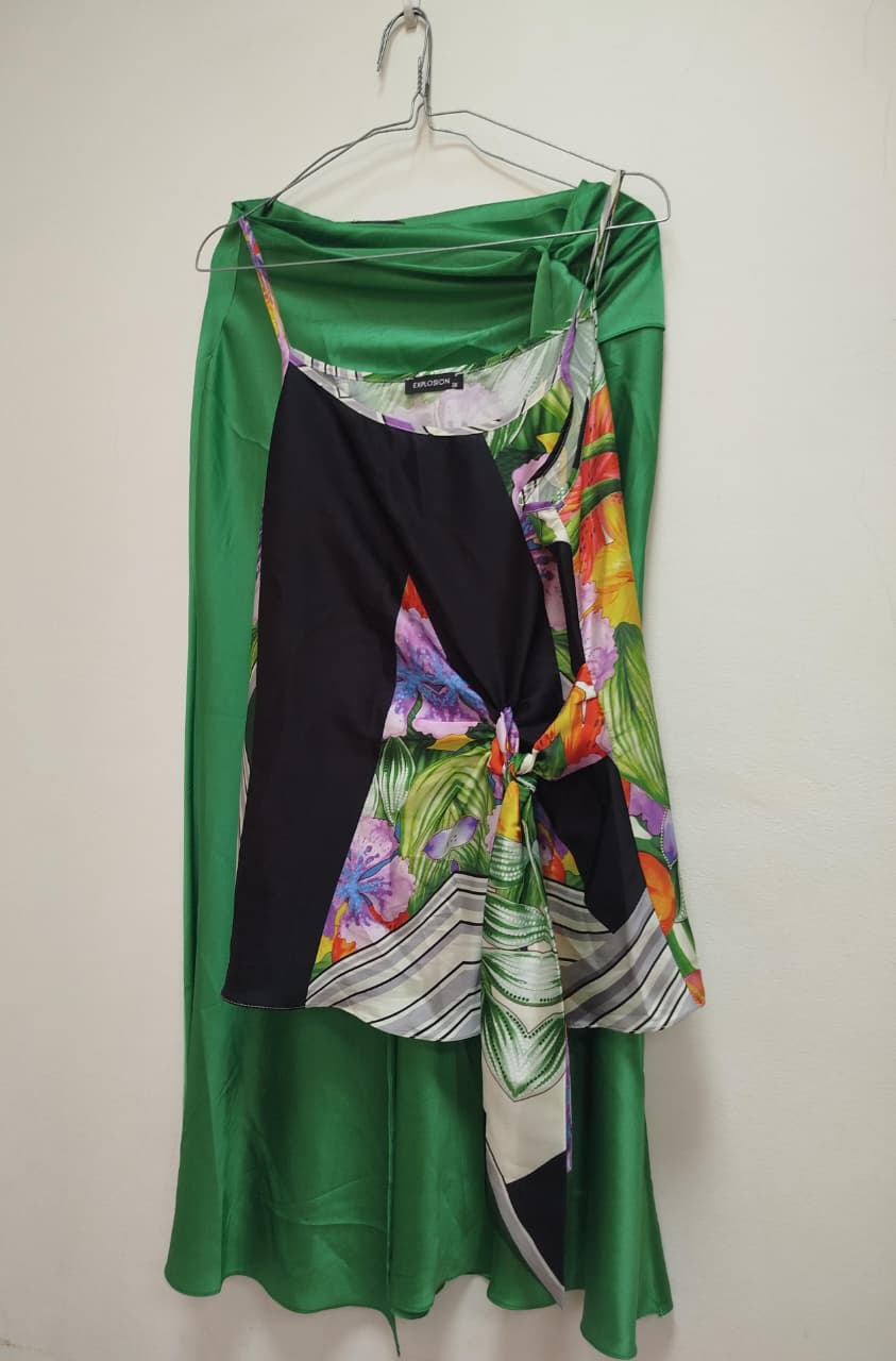 Pour compléter cette tenue, nous avons choisi une jupe fluide en satin vert émeraude 💚. Sa texture soyeuse et son éclat raffiné créent un contraste harmonieux avec l’imprimé tropical du top. Cette pièce apporte une note de sophistication et d’élégance, idéale aussi bien pour une sortie décontractée que pour une soirée estivale chic.