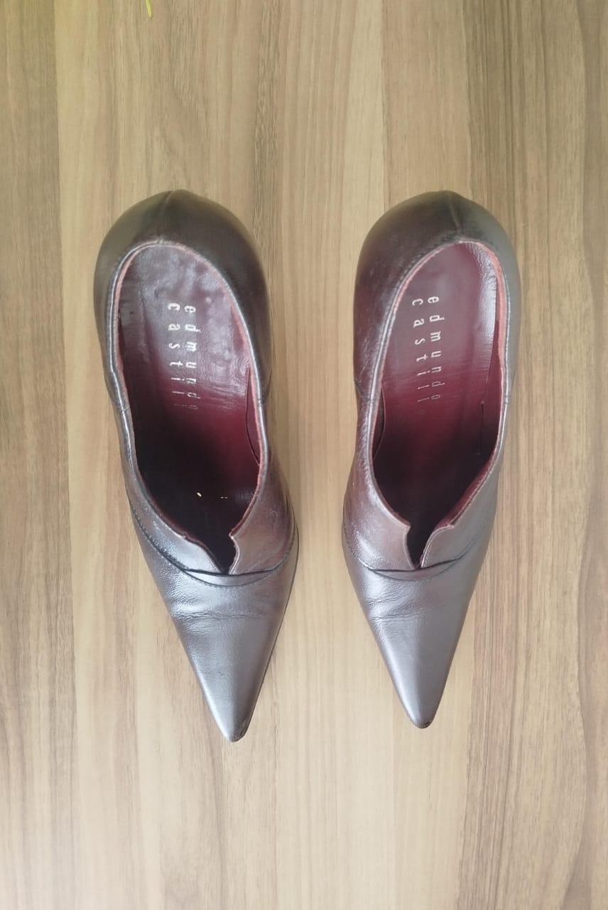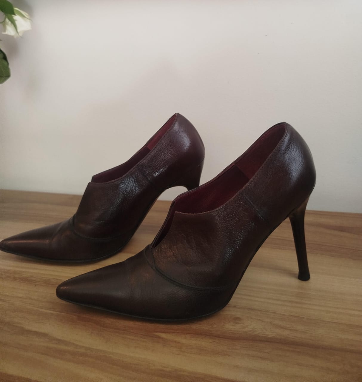 Ces escarpins en cuir brun se distinguent par leur silhouette élégante à bout pointu et leur talon fin qui allonge la jambe. Un modèle intemporel, idéal pour une tenue de bureau chic ou une soirée habillée