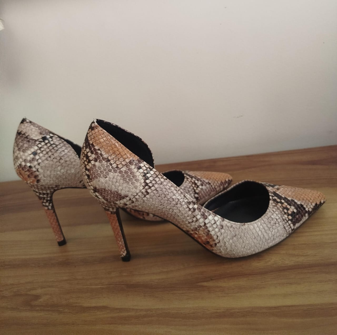 Audacieux et sophistiqués, ces escarpins à imprimé python se démarquent par leur talon aiguille élancé et leur coupe féminine. Parfaits pour rehausser une tenue de soirée ou apporter une touche glamour à un look chic.