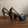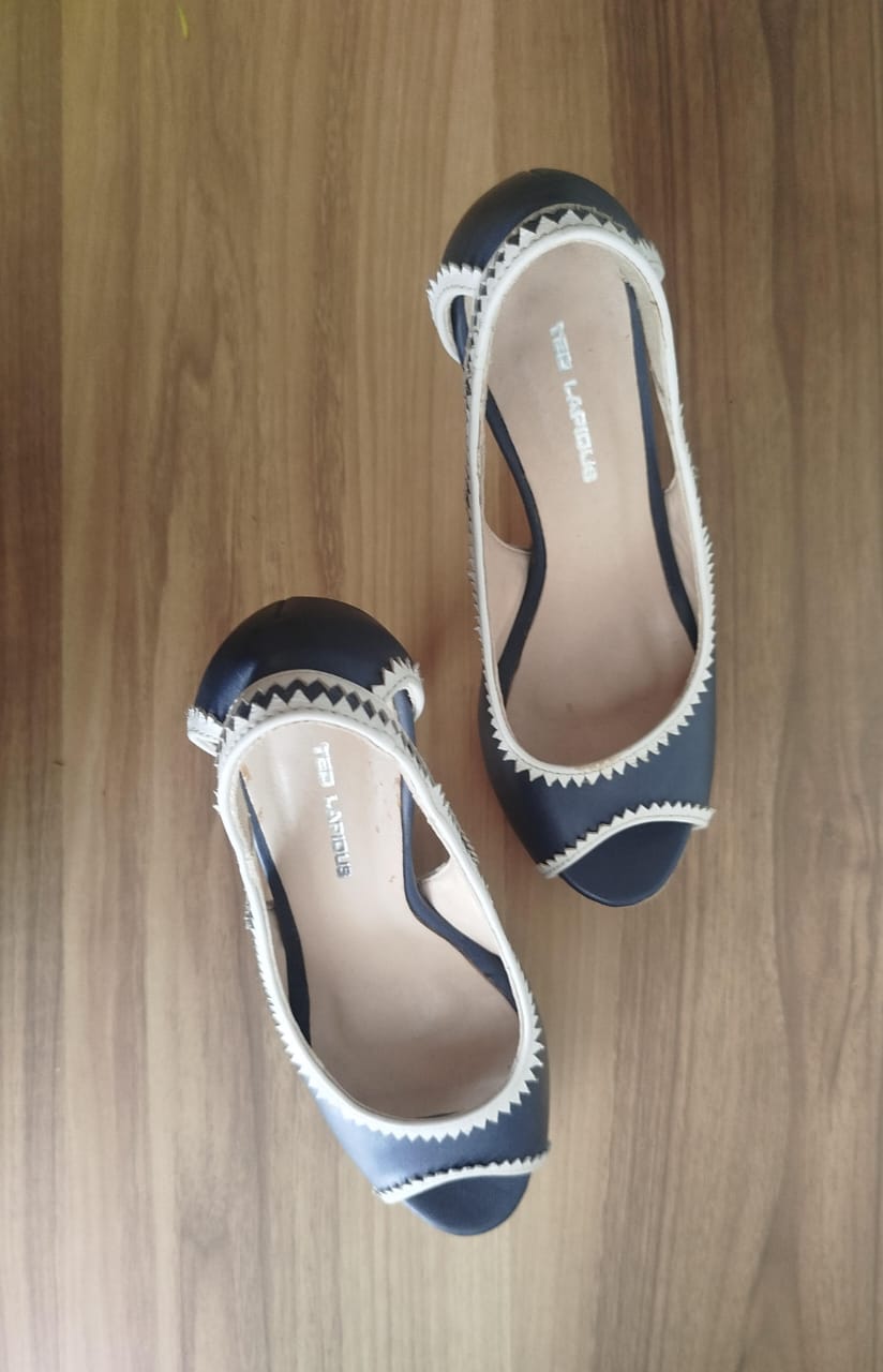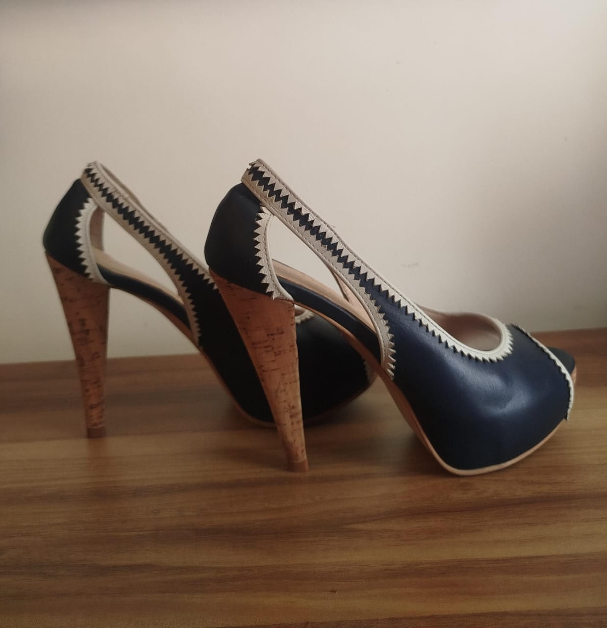 Ces escarpins peep-toe bleu marine se distinguent par leur talon haut à l’effet liège naturel et leur bordure contrastante en zigzag. Idéals pour une allure chic et estivale, ils complètent parfaitement une tenue de soirée ou un look habillé.
