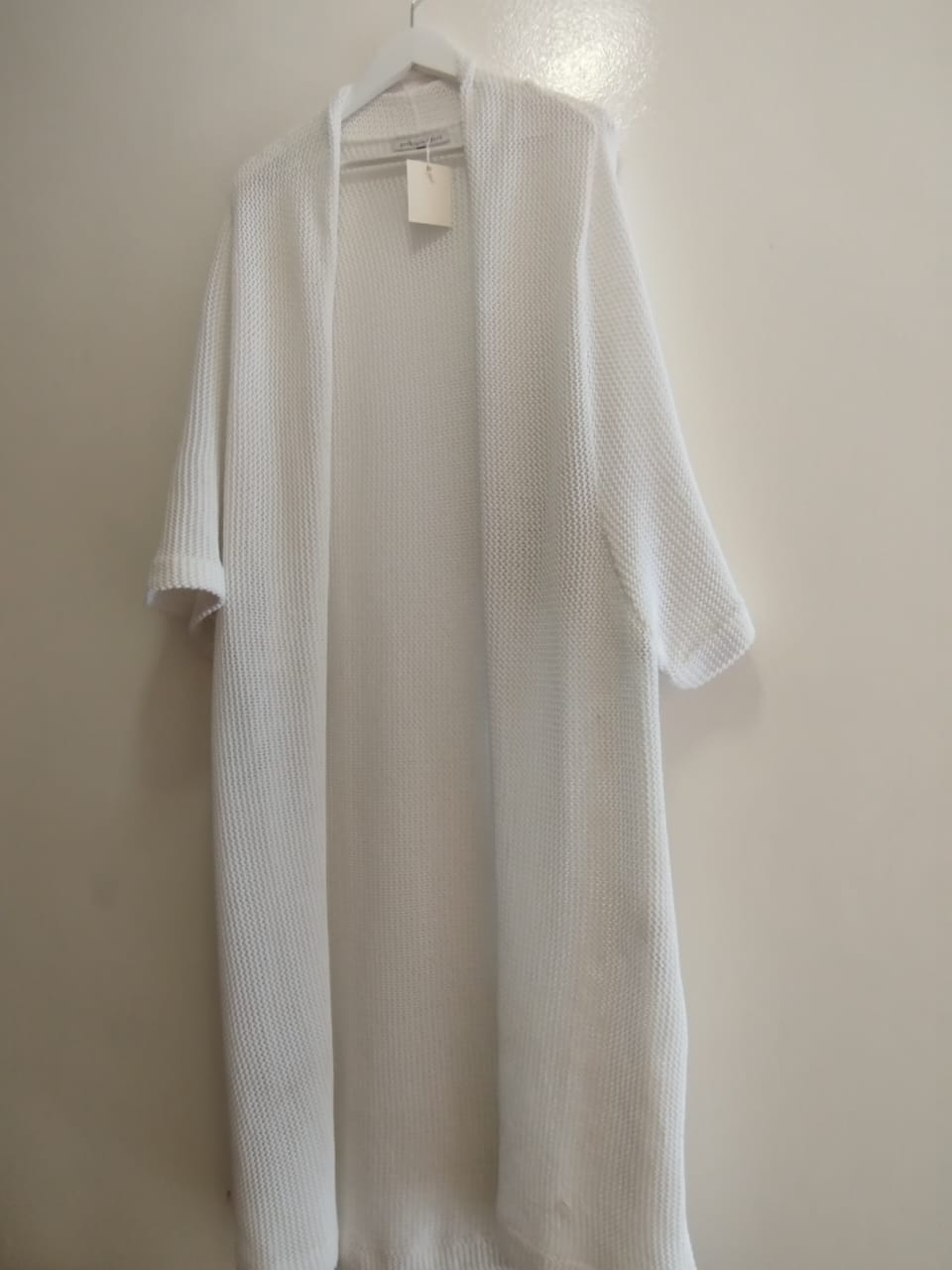 Un gilet cardigan long de couleur blanche, élégant et confortable, parfait pour compléter vos tenues avec une touche chic et douce.
