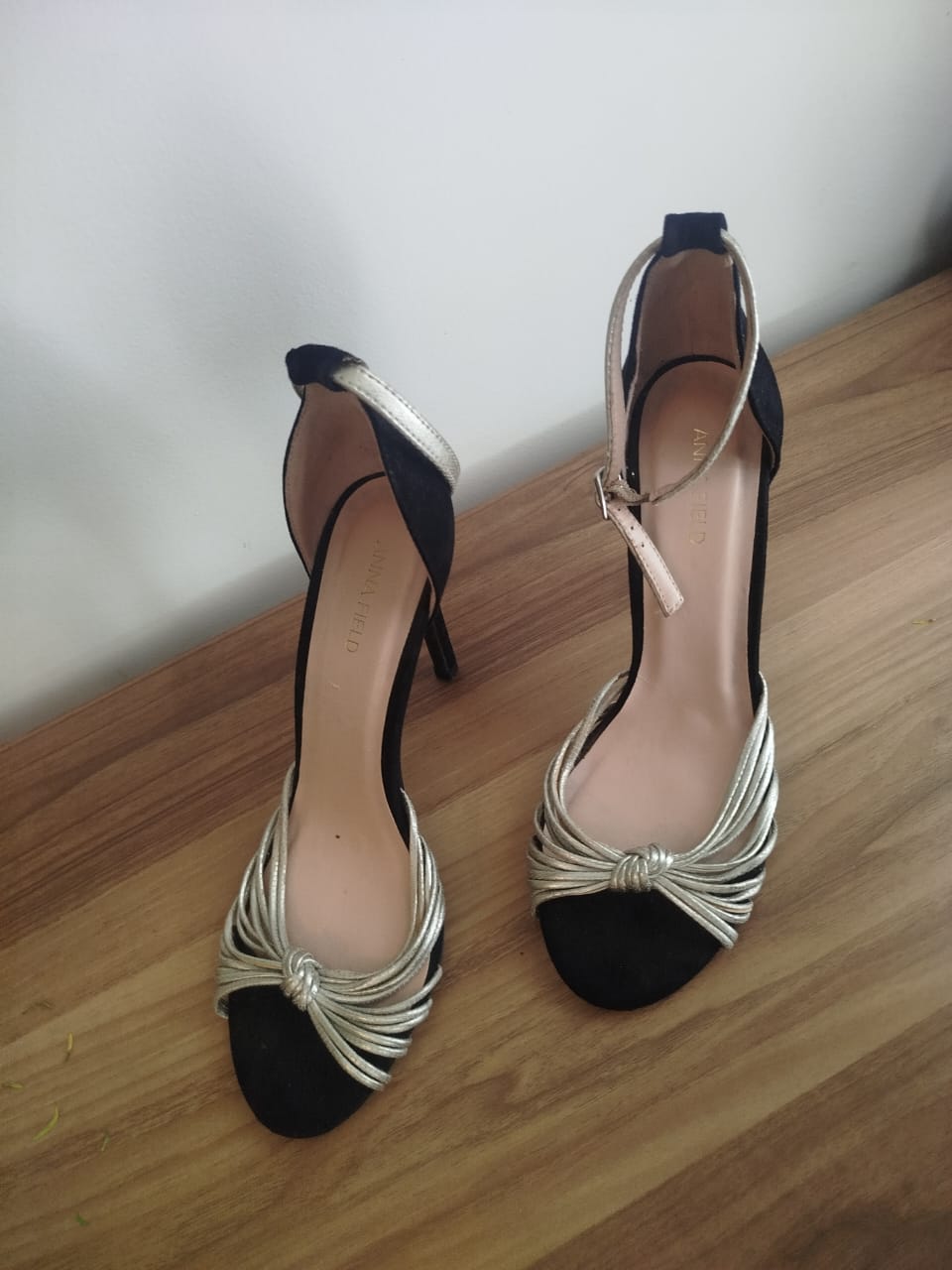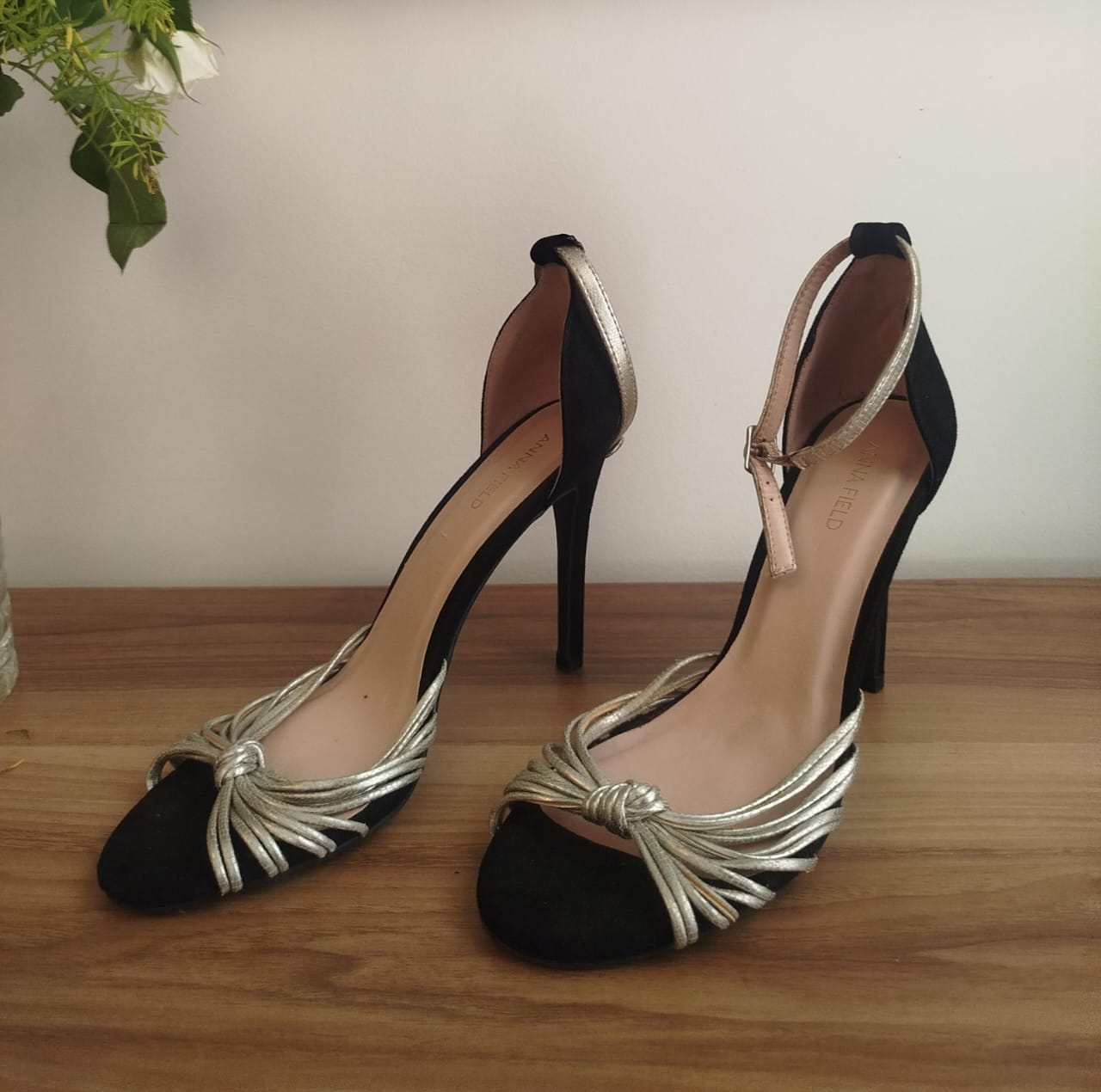 Élégantes et festives, ces sandales à talons noirs se distinguent par leurs lanières argentées entrelacées sur l’avant et leur bride cheville ajustable. Idéales pour une soirée ou un événement chic, elles subliment instantanément une tenue de cocktail ou un look de fête.